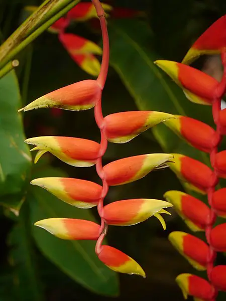 Some species, such as Heliconia rostrata, has downward facing flowers which dangle down from the main stem.