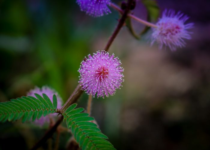 Mimosapudica is delicate and sensitive plant native to South America, but widespread in tropical, subtropical and temperate areas all over the world. It is a spiny annual or short-lived evergreen perennial, with divided leaves that are sensitive to touch. The flowers bloom in summer and are pollinated by the wind and insects.